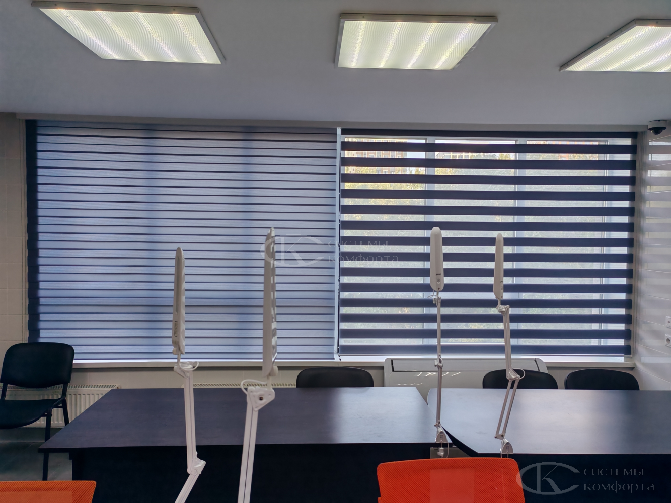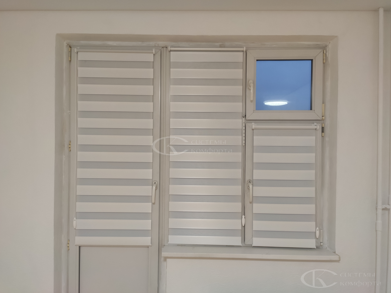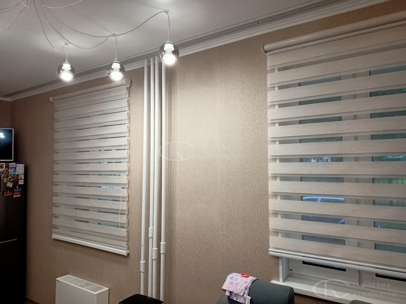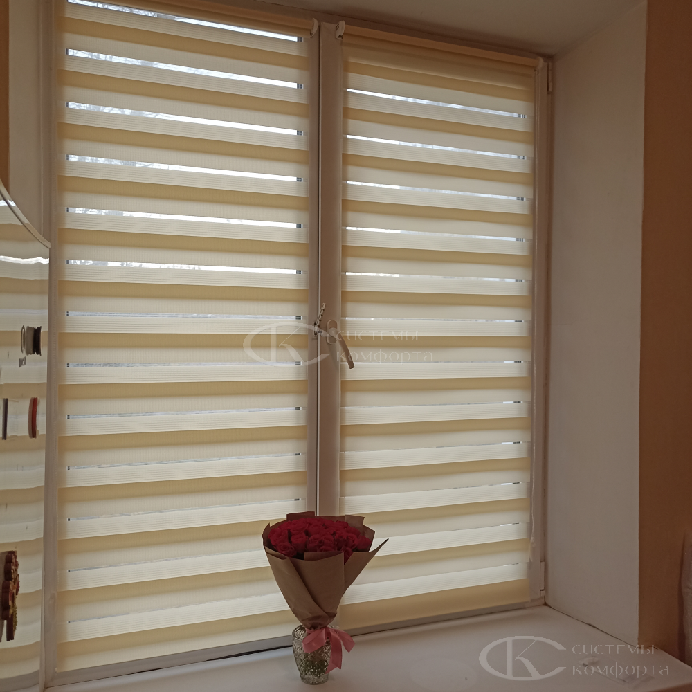 Эту модель штор производят из материалов с разными пропускными характеристиками солнечных лучей. Они позволяют создавать в помещении атмосферу темного и светлого времени суток. Такие шторы называются комбинированными. Второе их название — зебра или комбо.