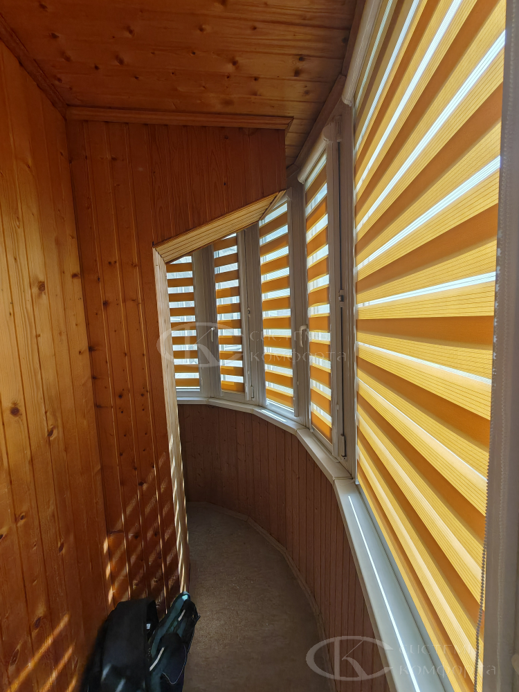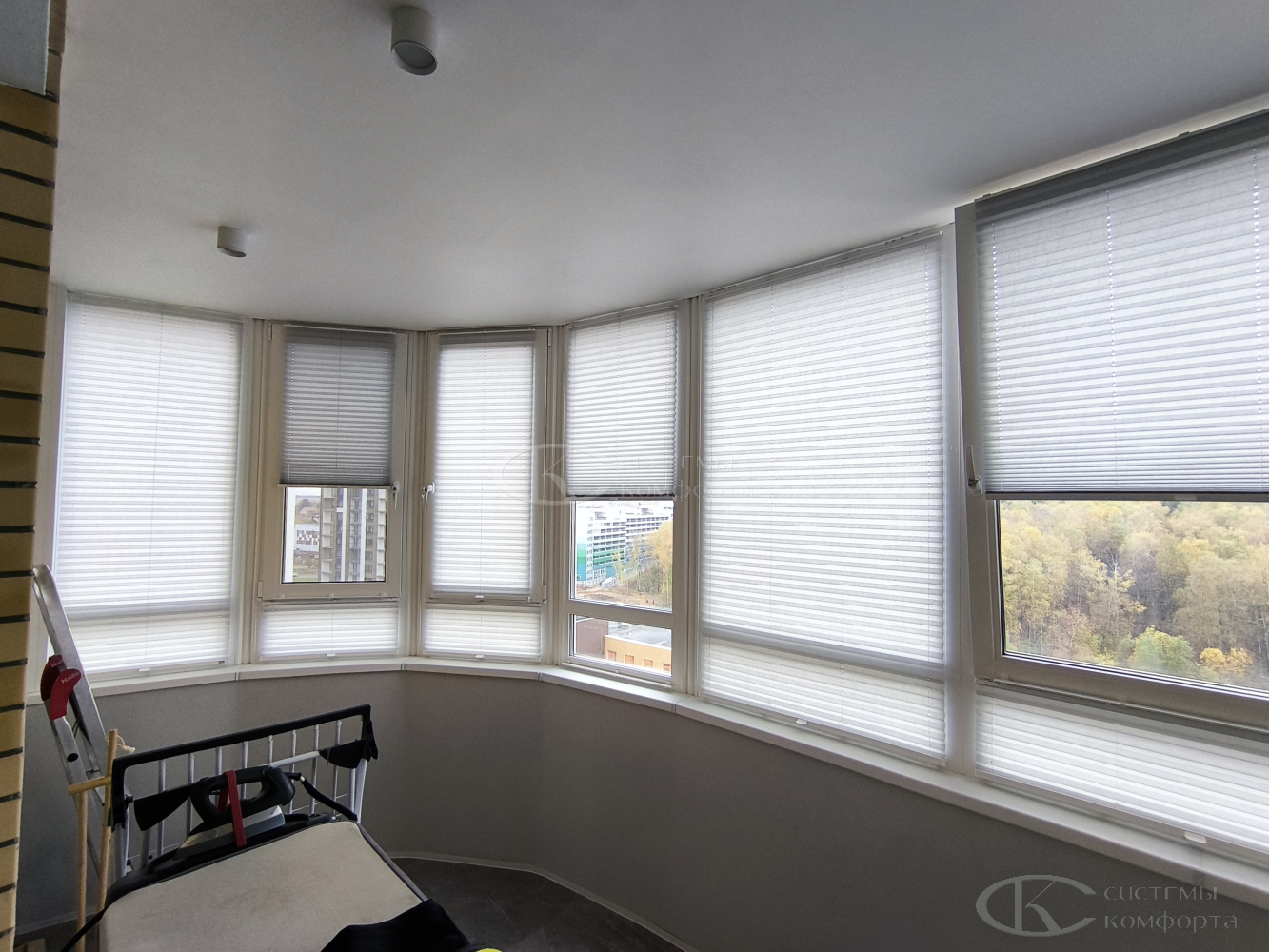 Достаточно дорогой вариант, сочетающий достоинства обычных пластиковых жалюзи и штор. Полотно собрано в чёткие складки, в опущенном виде выглядит как штора, а в собранном занимает минимум места. Особенно эффектно плиссированные жалюзи смотрятся на лоджиях с большой площадью остекления.