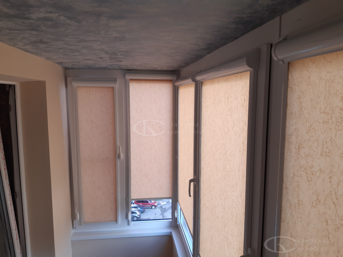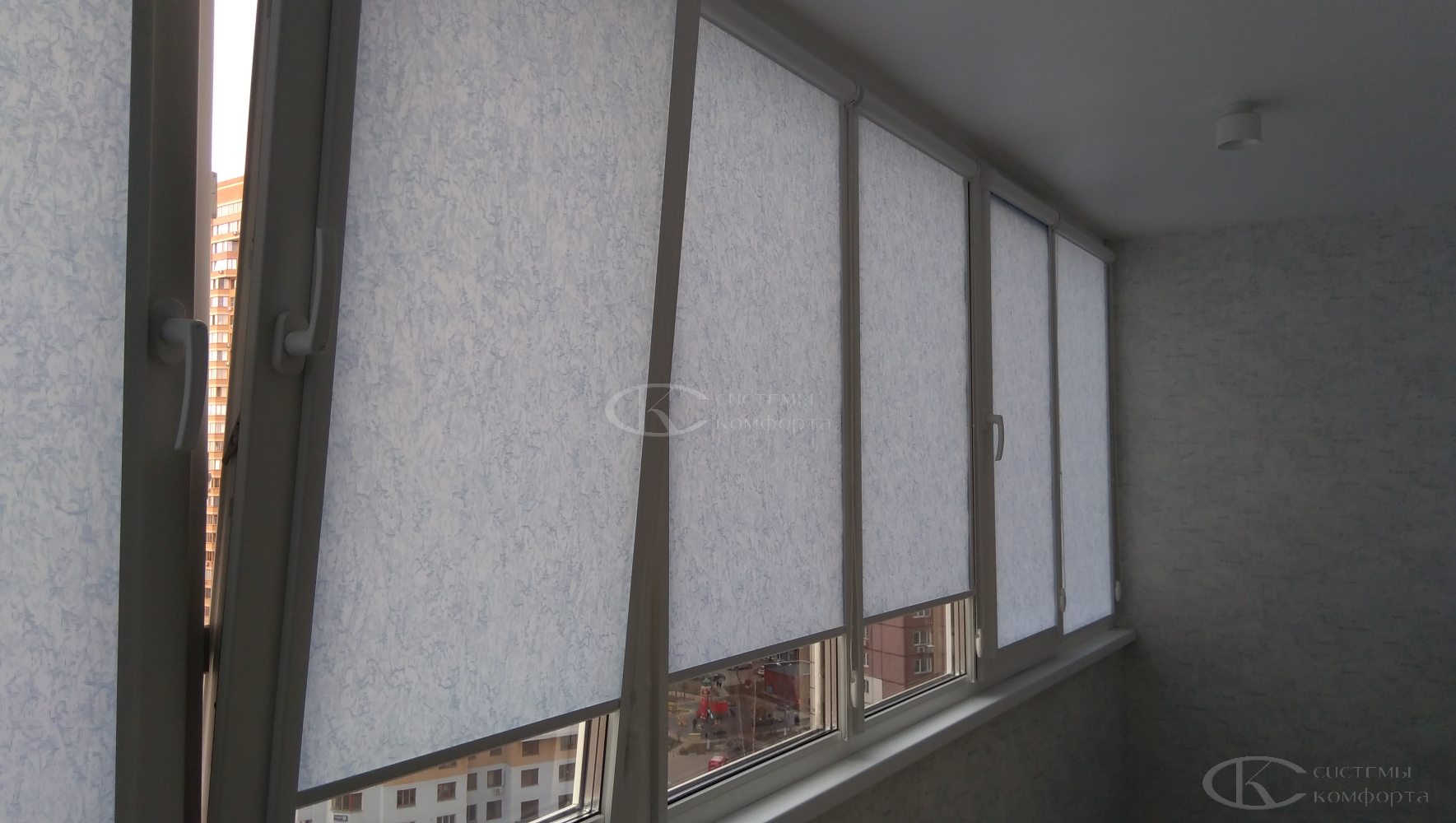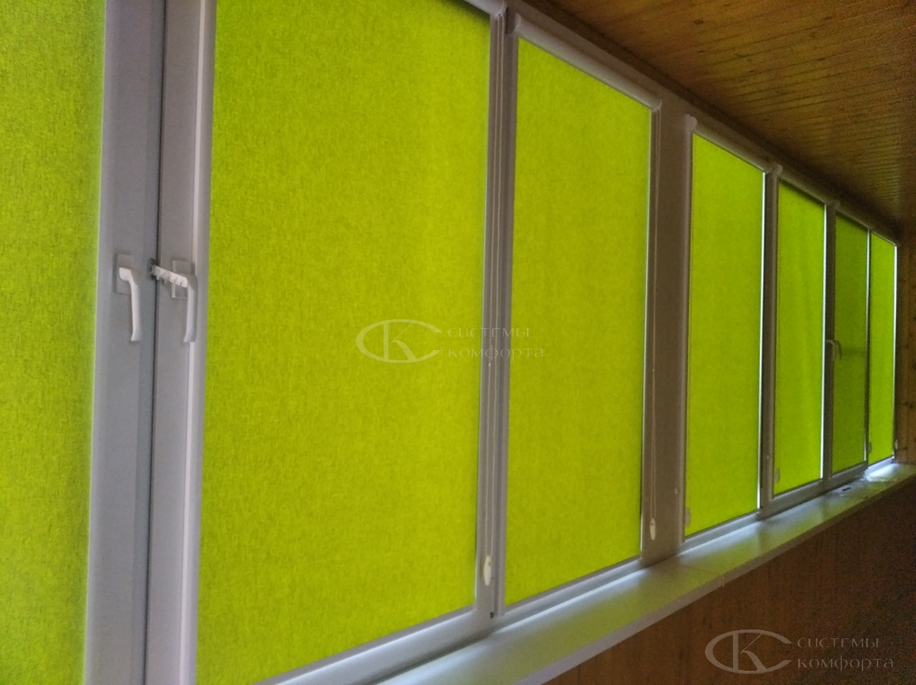 Рулонные жалюзи на балкон устанавливают на распашные или откидные рамы. Не подходят для раздвижных створок. Для изготовления используются ткани различных цветов и фактур. Рулонные шторы бывают свободновисящими или кассетными. Вторые удобны тем, что полотно не болтается на ветру, а направляющие из алюминия защищают полотно от пыли и копоти, летящих с улицы.